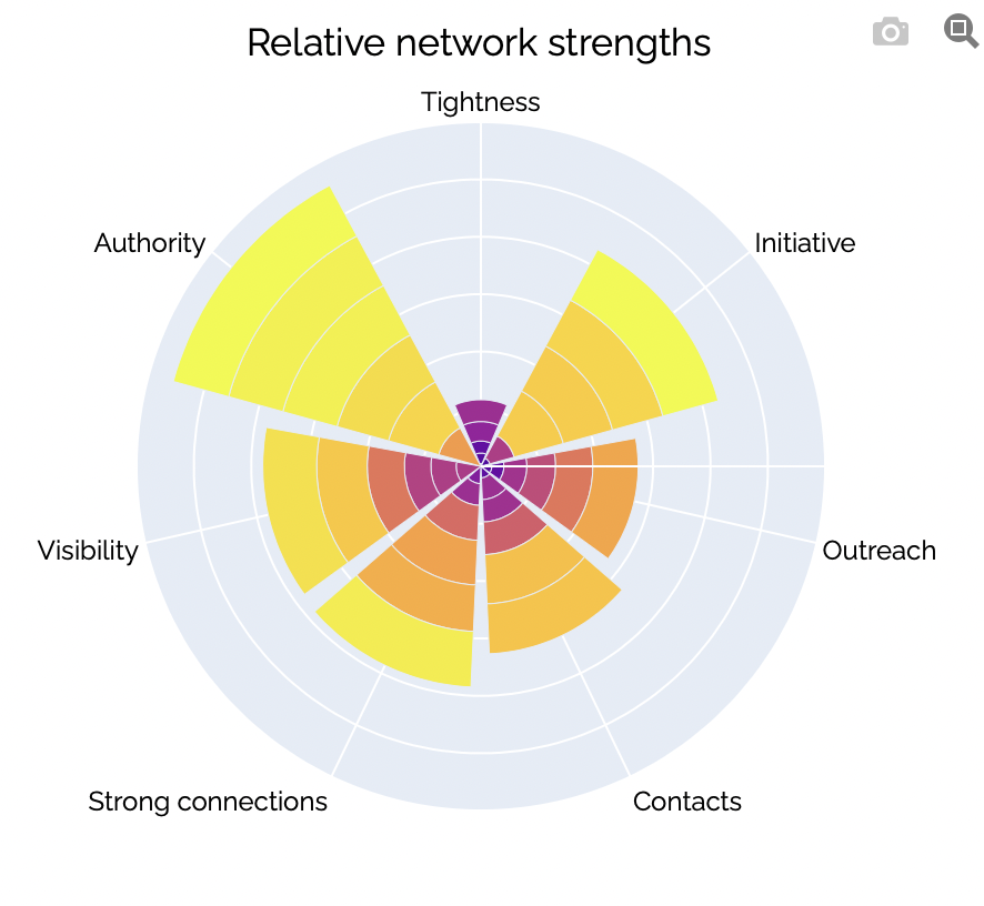 An example of a network strength analysis of a team, generated by XPNDR. You can see at a glance that this team is relied on by colleagues for their authority and takes plenty of initiative, but it is not very tight-knit .