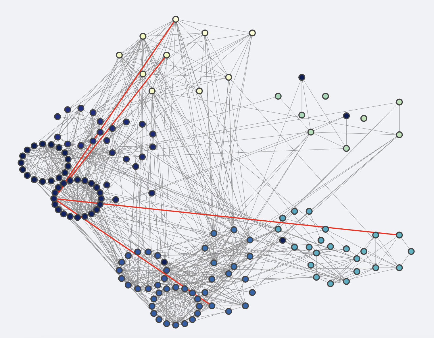 A network representation of a few recommendations generated by XPNDR. Each dot represents a person, a circle of dots is a team. The grey lines represent significant interactions between people. The red lines represent interactions that are not (yet) present in the network, but that, according to XPNDR, would improve the integration into the network for one of the employees (at the intersection of the lines, on the left). XPNDR computes similar recommendations for every individual and team.