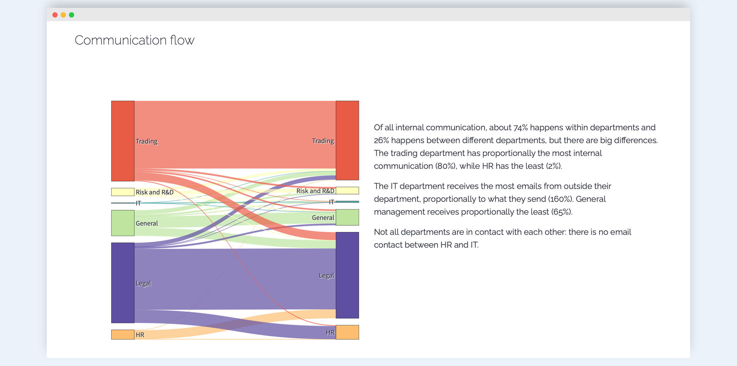 Organisations are all about communication. You don’t want to spy, but how do you know what is actually going on? XPNDR monitors communication activity without impacting privacy. Using statistical methods, data science and AI to extract the relevant trends and developments, XPNDR translates all these insights into understandable graphs and readable texts, to inform you quickly of the situation, and alert you when new developments require your attention.