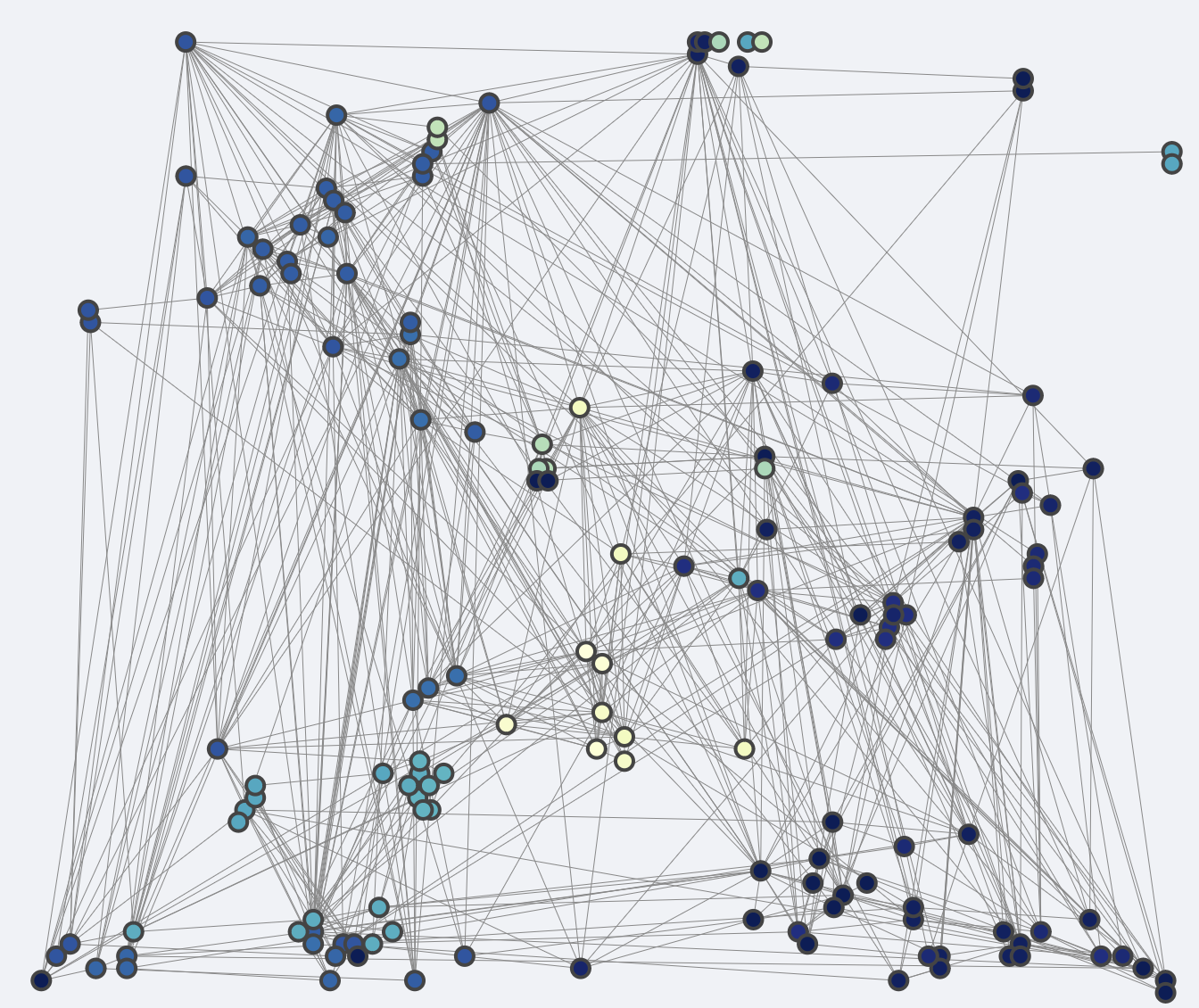 A map of the communication of a real organisation, as computed by XPNDR. Each node represents a person. A pair of nodes is connected by an edge if the two corresponding people had a meaningful amount of communication between them in the past two years. The colour of the nodes represents the teams the person is in. Note that this does not look very much like a hierarchy.