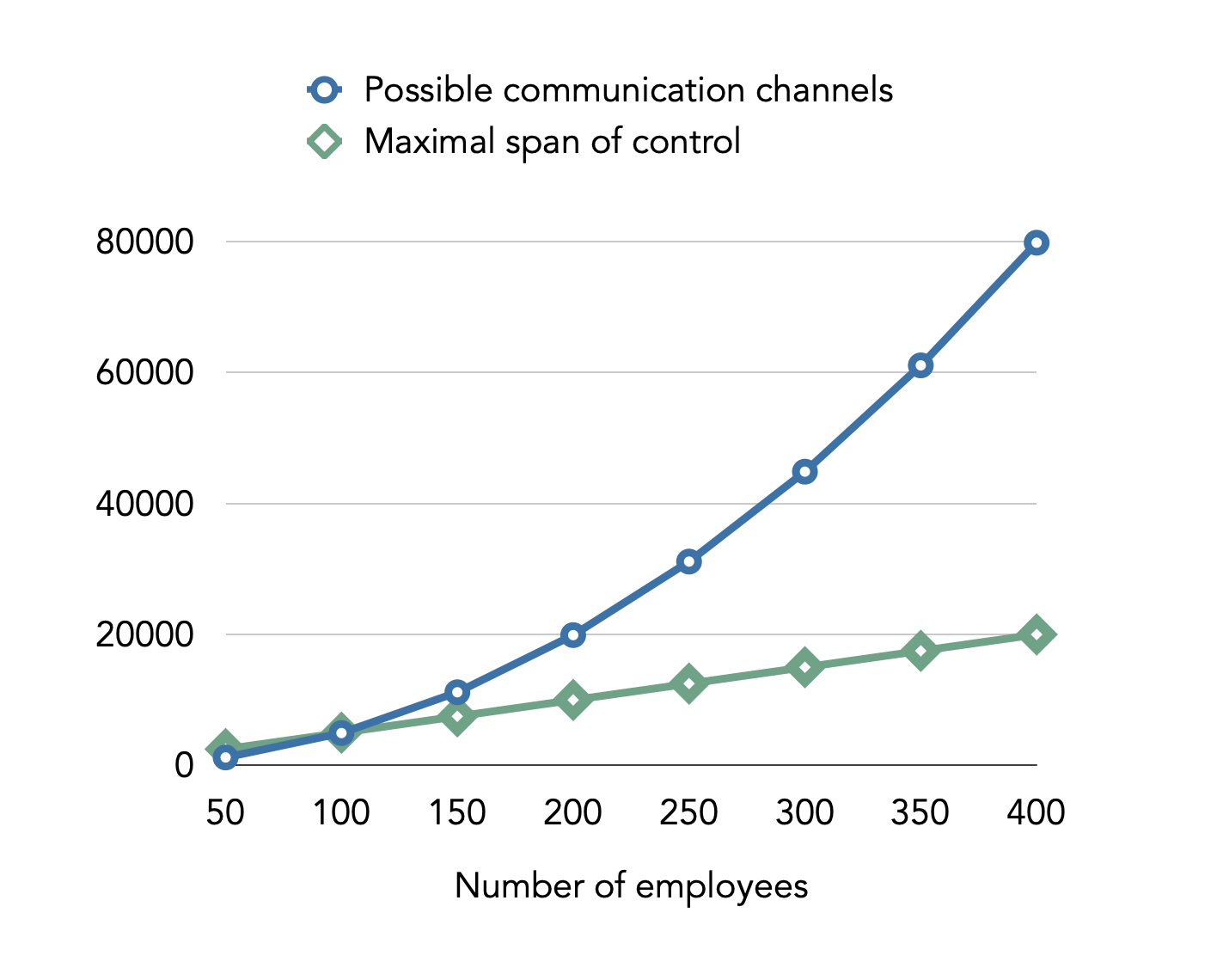 In smaller organisations everyone can get to know another. When organisations grow beyond a certain size, this is no longer possible: the number of communication channels grows much faster than the span of control